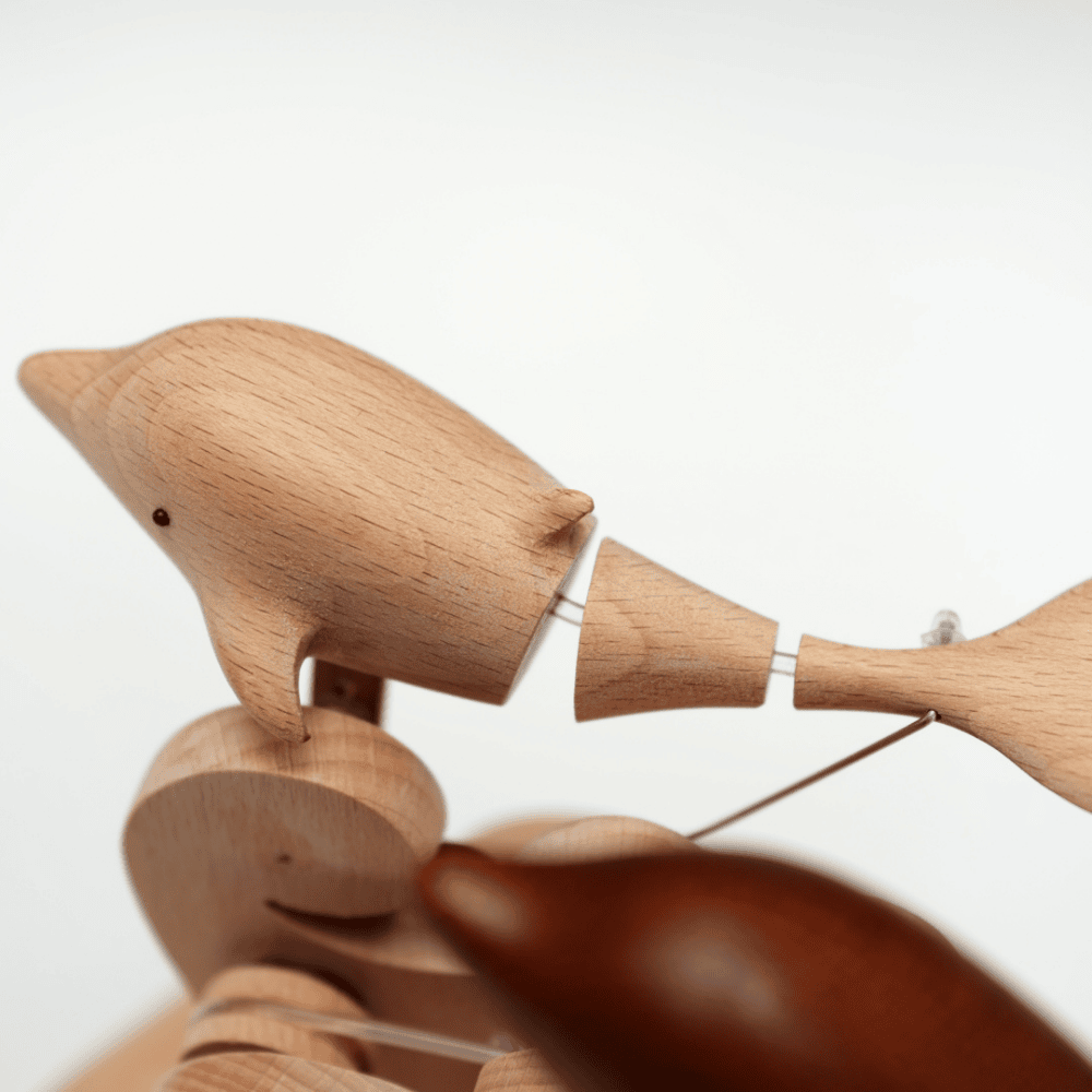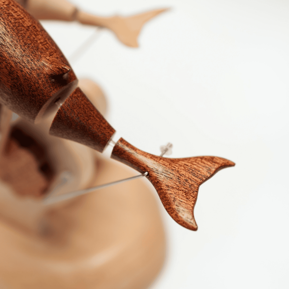 Crafted from two different woods—one beechwood, one walnut—these twin dolphins move together in synchronized motion. Different in tone and grain, yet united in rhythm, they symbolize friendship, love, and meaningful connection.