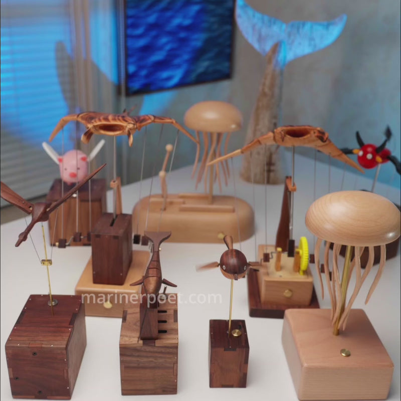 Découvrez les Automates en Bois de MARINER POET—des créatures en mouvement faites à la main. Silencieuses ou musicales, chaque pièce apaise, connecte et élève votre espace.